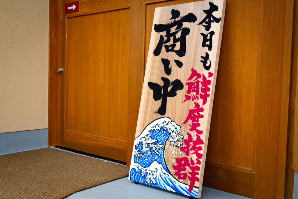 今回、なんといっても営業中板を「このお店の顔にする」というくらいの意気込みで描きました。この1枚で板でどんな食材を、どんな品質で食べられるかを直感的に訴えかける、というテーマで考えました。全国でもなかなかこんな営業中板はないんじゃないでしょうか。
