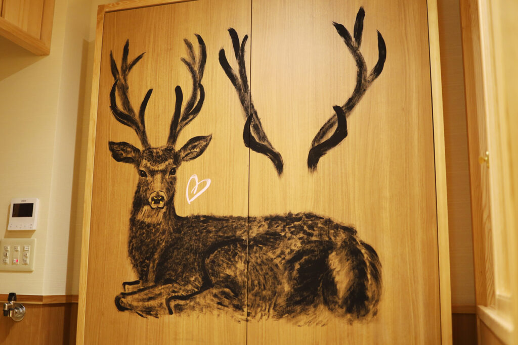 もう一箇所は奈良市にちなんで鹿の絵を。観光地のど真ん中で外国の方が多いので、少しでも楽しんでもらえたらという想いで描かせていただきました。